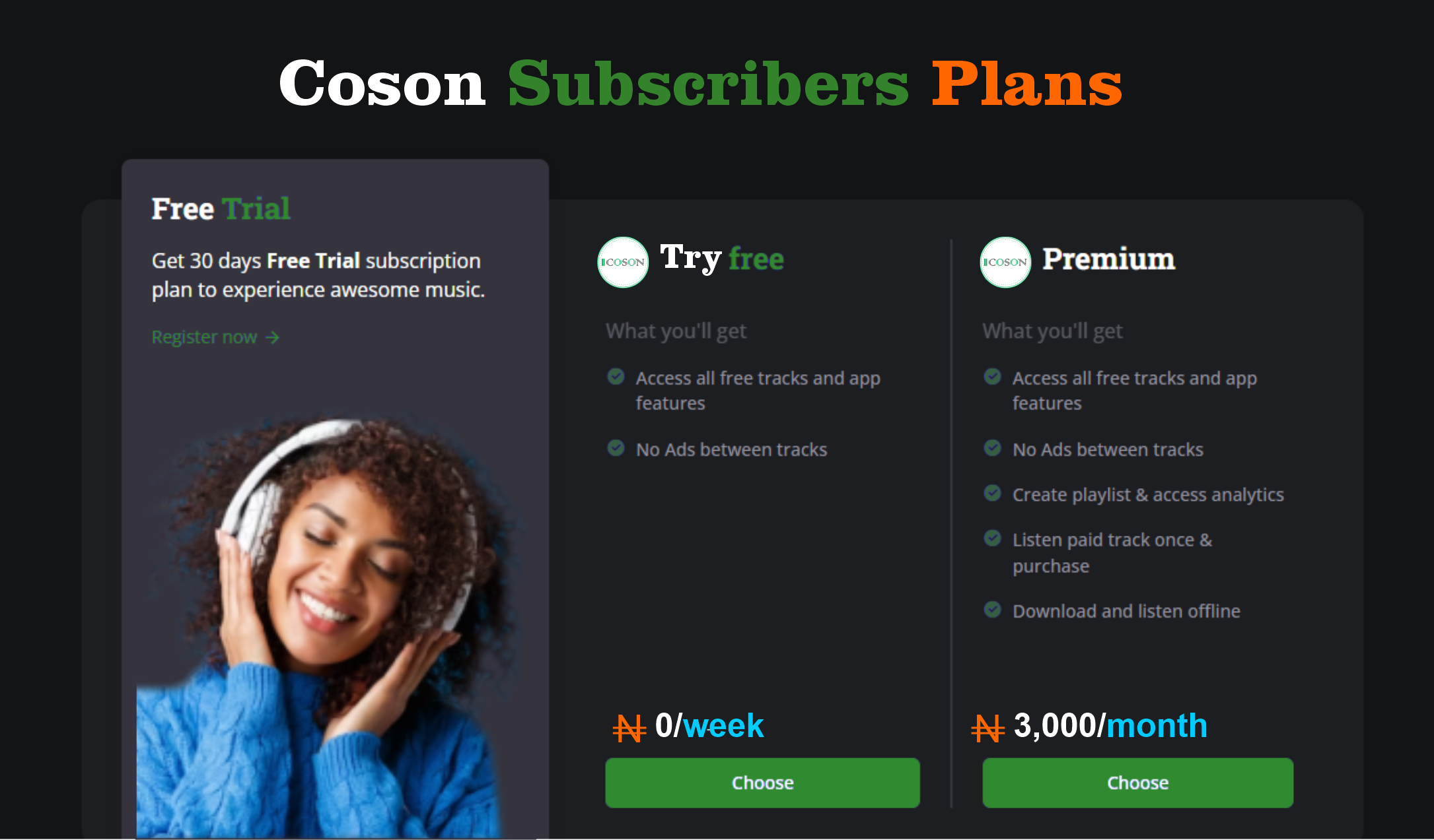 Discover all Nigerian music at your fingertips. Subscribe for unlimited access or listen completely free. All genre of Nigerian music is available at Coson